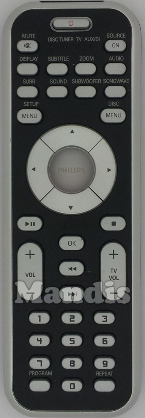 Power, Mute, On Source, Display, Subtitle, Zoom, Audio, Surr, Sound, Subwoofer, Sonowave, Menu/Setup, Menu Disc, Up, Down, Right, Left, OK, Play/Pause, Stop, I<<, >>I, Vol+, Vol-, Tv Vol-, Tv Vol+, 1, 2, 3, 4, 5, 6, 7, 8, 9, 0, Repeat, Program