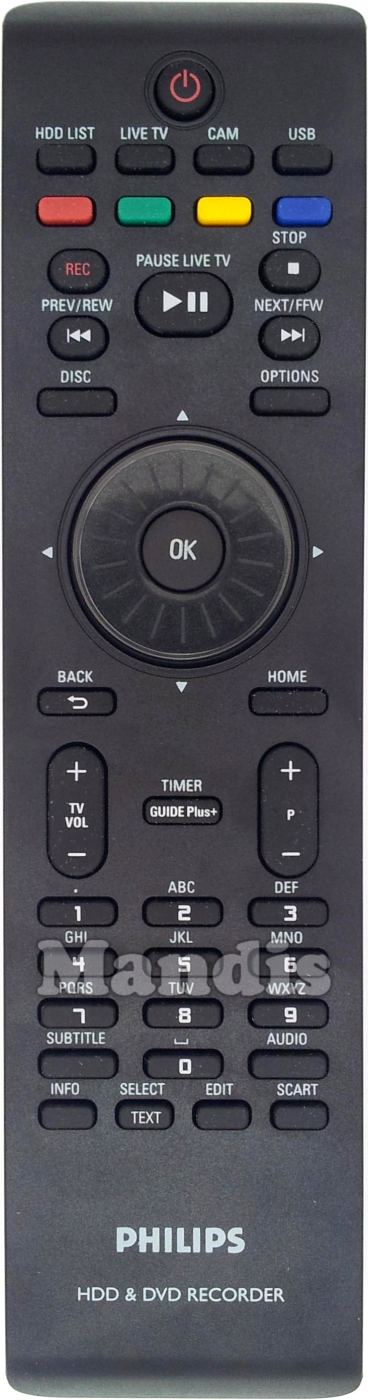 Power, HDD List, Live TV, CAM, USB, Red, Green, Yellow, Blue, Rec, Play / Pause / Pause Live TV, Stop, I<< / Prev / Rew, >>I / Next / FFW, Disc, Options, Up, Down, Right, Left, OK, Home, aaaTV Vol +, TV Vol -, cGuide Plus+ / Timer, P +, kP -, 1, 2, 3, 4, 5, 6, 7, 8, 9, 0, Subtitle, Audio, Info, Back, Edit, Scart, Text/Select
