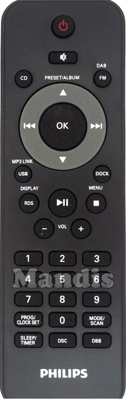 Power, Mute, CD, FM / DAB, Up / Preset/Album +, Down / Preset/Album -, Left / I<<, Right / >>I, OK, USB / MP3 Link, Dock, RDS / Display, Play / Pause, Stop / Menu, Vol -, Vol +, 1, 2, 3, 4, 5, 6, 7, 8, 9, 0, Prog / Clock Set, Mode / Scan, Sleep / Timer, DSC, DBB