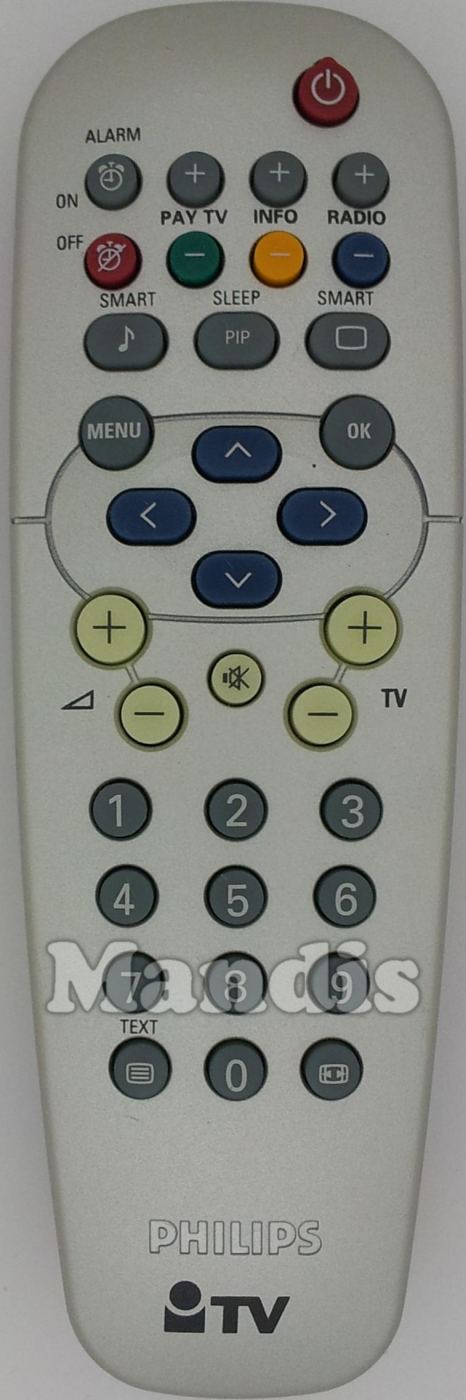 Power, Alarm On, Alarm Off/Red, Pay TV+, Pay TV-/Green, Info+, Info-/Yellow, Radio+, Radio-/Blue, ♪/Smart, PIP/Sleep, ▭/Smart, Menu, OK, Up, Down, Left, Right, Vol+, Vol-, Mute, TV+, TV-, 1, 2, 3, 4, 5, 6, 7, 8, 9, 0, [≡]/Text, [<>]