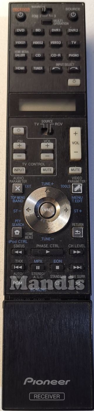 Power Receiver, Power Source, DVD, BD, DVR1, DVR2, VIDEO1, VIDEO2, VIDEO3, TV, Gallery / Home Media, CD, CD-R, PHONO, HDMI, TUNER, Input Select-, Input Select+, Bulb, TV CH+, TV CH-, TV Power, TV Vol+, TV Vol-, TV Mute, TV Input, Vol+, Vol-, Audio Parameter / Exit / Top Menu / Band, Video Parameter / Tools / Menu / T.Edit, Mute, PTY Search / Home Menu / iPod CTRL, Return, Up / Tune+, Down / Tune-, Right / ST+, Left / ST-, Enter, Status / <<, Phase Ctrl / Play, CH Level / >>, THX / I<<, MPX / Pause, EON / Stop, >>I, Auto / Direct / PGM, Stereo / A.L.C. / BD Menu, Standard / Repeat, ADV Surr / Random, Signal Sel / 1, Sleep / 2, Dimmer / 3, SR+ / 4, SBch / 5, MCACC / 6, A.Att / 7, Genere / 8, HDMI Out / 9, 0, CLR / D.Access, Class / Enter, Audio, Disp, CH+, CH-