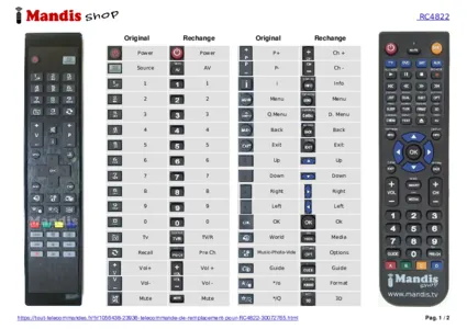 Cette télécommande remplace entièrement votre RC4822 et offre toutes les fonctions de l'originale.
