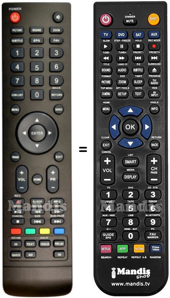 Ci-dessous, nous vous montrerons la correspondance entre chaque bouton de la télécommande d'origine et le bouton qui effectue la même fonction sur la télécommande de remplacement. Dans certains cas, vous devrez peut-être appuyer sur la touche SHIFT avant d'appuyer sur un autre bouton pour effectuer certaines actions. Ces fonctions supplémentaires sont souvent peu utilisées et sont incluses pour faciliter la compréhension de la télécommande de remplacement, ou parce que la télécommande d'origine comporte plus de boutons que son équivalent.