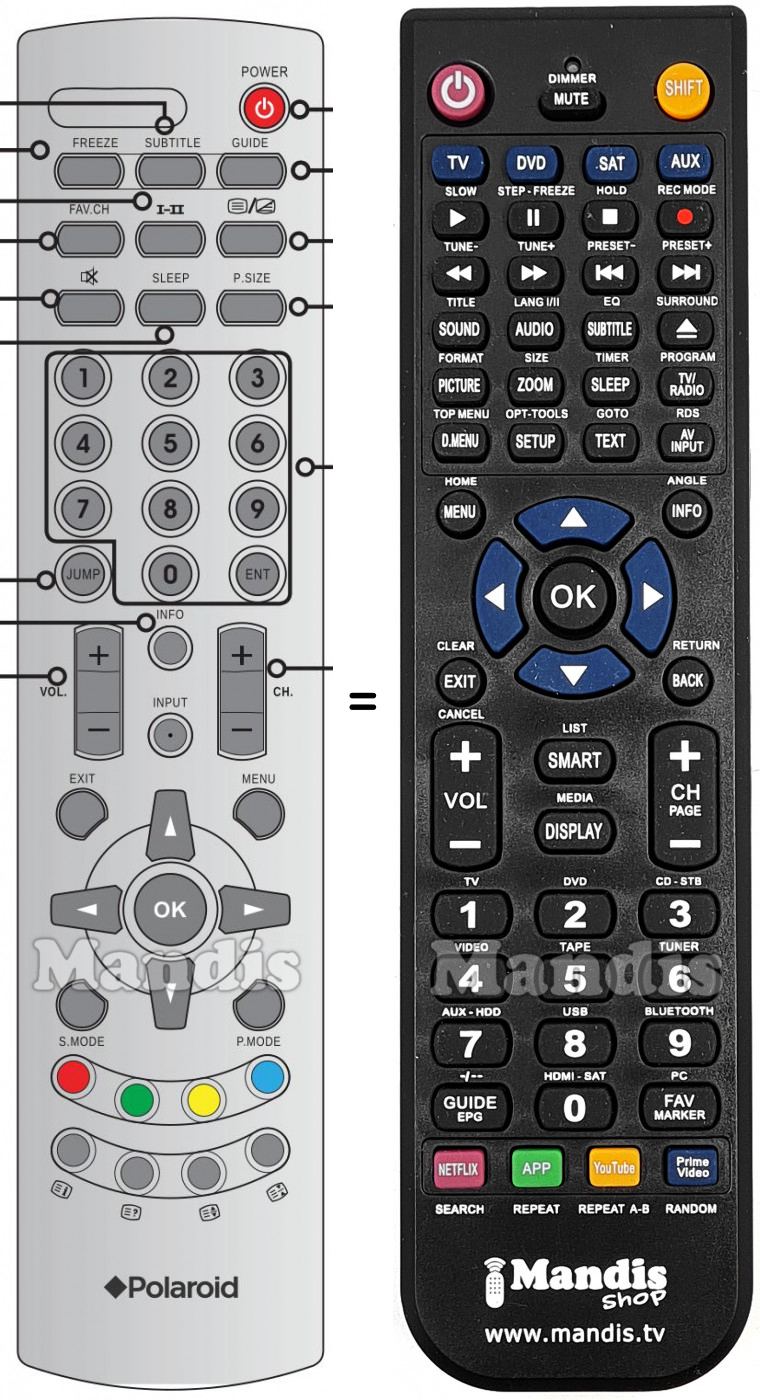 Cette télécommande remplace entièrement votre Polaroid001 et offre toutes les fonctions de l'originale.