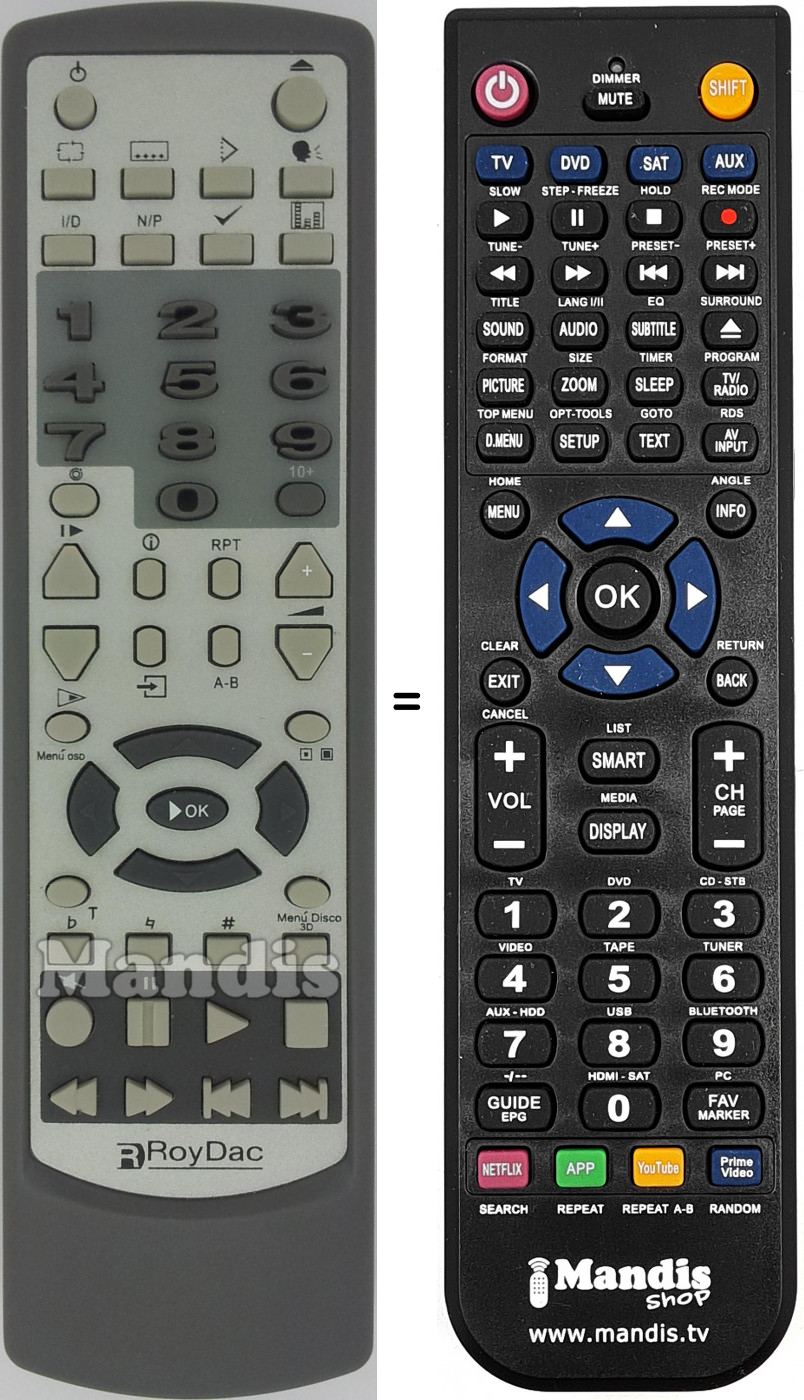 La télécommande équivalente exécute toutes les fonctions, même lorsque la télécommande d'origine commande divers appareils. Dans la télécommande équivalente, est possible de programmer différents appareils (TV, DVD, SAT et AUX) de manière à pouvoir inclure toutes les fonctions de la télécommande d'origine. Si vous voyez le manuel des touches (instructions de la télécommande), vous pouvez vérifier que toutes les fonctions sont présentes.