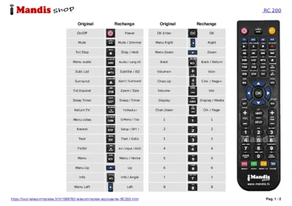 Cette télécommande remplace entièrement votre RC200 et offre toutes les fonctions de l'originale.