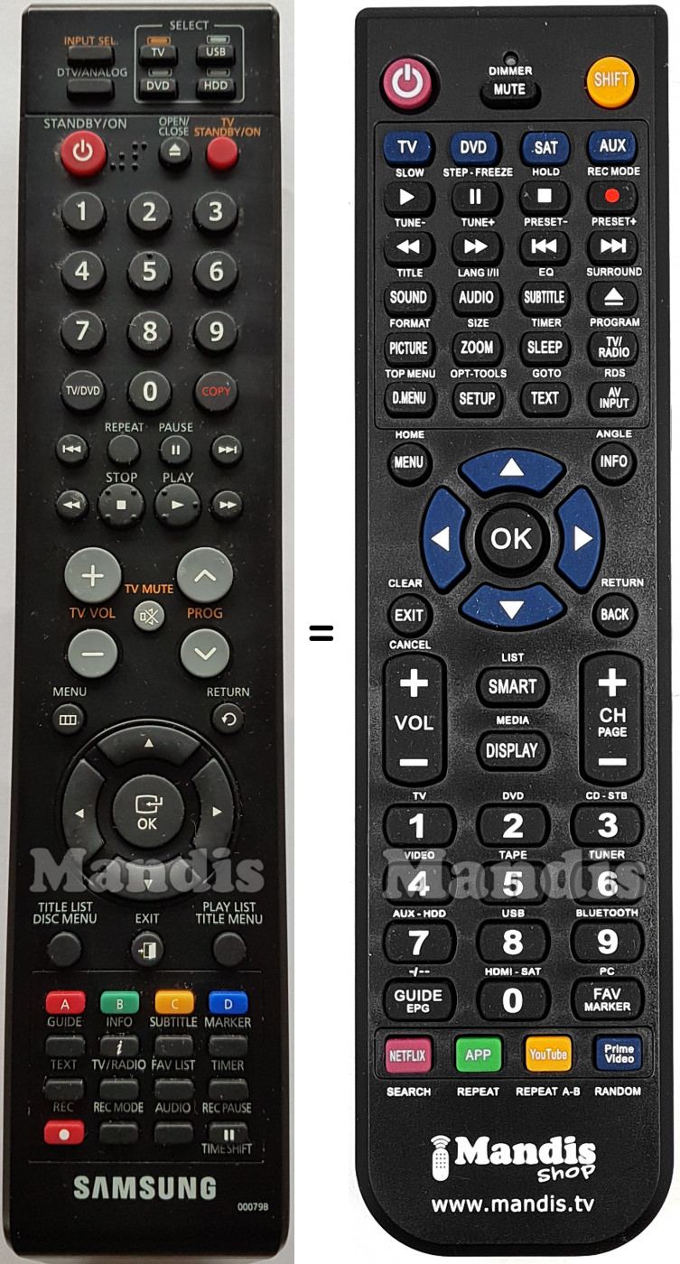 Cette télécommande remplit toutes les fonctions de la télécommande d'origine: INPUT SEL, DTV/ANALOG, SELECT TV, SELECT USB, SELECT DVD, SELECT HDD, STANDBY/ON, OPEN/CLOSE, TV STANDBY/ON, 1, 2, 3, 4, 5, 6, 7, 8, 9, 0, TV/DVD, COPY, I<<, REPEAT, PAUSE, >>I, <<, STOP, PLAY, >>, TV VOL+, TV VOL-, PROG+, PROG-, TV MUTE, MENU, RETURN, TITLE LIST DISC MENU, EXIT, PLAY LIST TITLE MENU, OK, UP, DOWN, RIGHT, LEFT, RED, GREEN, YELLOW, BLUE, GUIDE, INFO, SUBTITLE, MARKER, TEXT, TV/RADIO, FAV LIST, TIMER, REC, REC MODE, AUDIO, REC PAUSE/ TIME SHIFT