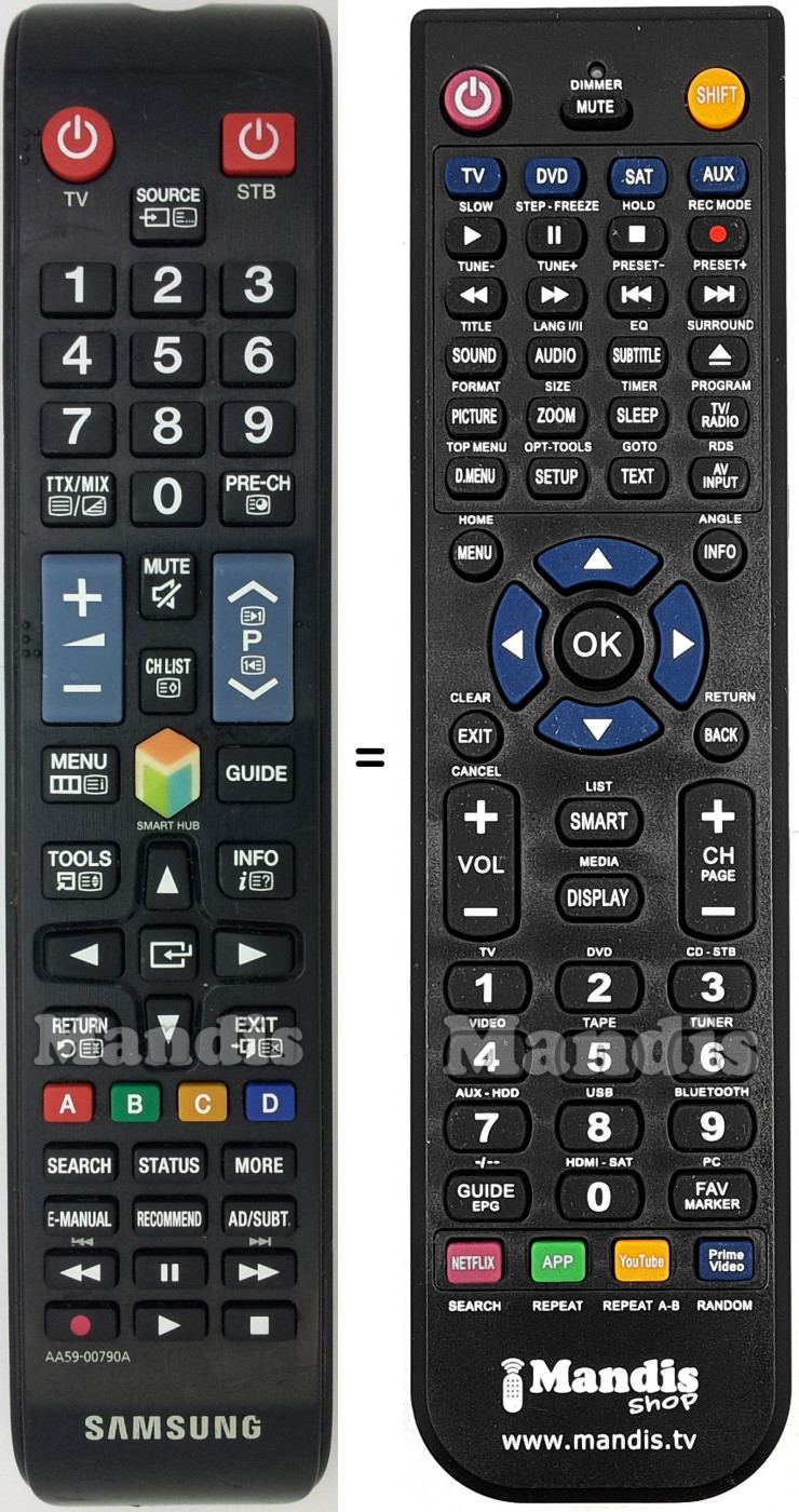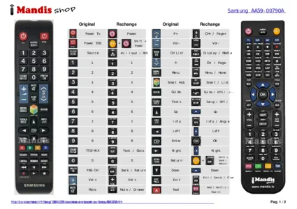 Cette télécommande remplit toutes les fonctions de la télécommande d'origine: Power TV, Power STB, Source, 1, 2, 3, 4, 5, 6, 7, 8, 9, 0, TTX / MIX, Pre-Ch, Vol +, Vol -, Mute, CH List, P +, P -, Menu, Smart Hub, Guide, Tools, Info, Up, Down, Right, Left, , Return, Exit, Red / A, Green / B, Yellow / C, Blue / D, Search, Status, More, E-Manual, Recommended, AD / Subt., << / I<<, Pause, >> / >>I, Rec, Play, Stop