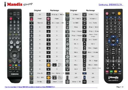 Cette télécommande remplit toutes les fonctions de la télécommande d'origine: TV, DVD, STB, CABLE, VCR, Power, Source, 1, 2, 3, 4, 5, 6, 7, 8, 9, 0, -/--, Pre-Ch, TV / DTV, CH. Mgr., D.Menu, TV / Radio, << REW, Stop, Play / Pause, FF >>, Vol +, Vol -, Mute, P +, P -, Menu, Exit, Up, Right, Down, Left, Enter / OK, Guide, Info, TTX / Mix, Red, Green, Yellow, Blue, PIP, Dual I-II, Still, Subtitle, Text, Back, Alt, APP