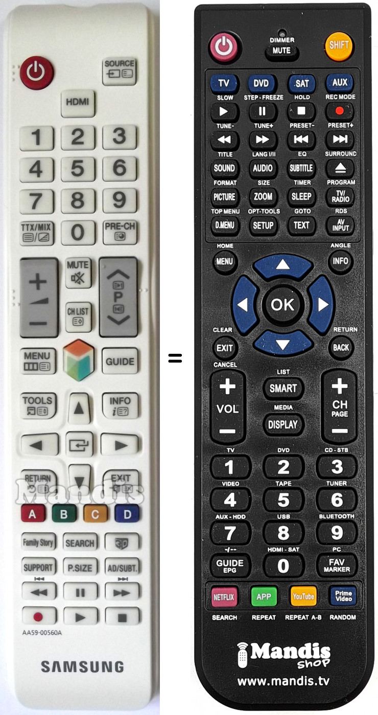 Télécommande qui remplace la télécommande d'origine AA59-00560A car elle possède les mêmes fonctions. Il ne s'agit pas d'une télécommande universelle mais d'une télécommande qui remplace celle d'origine. Vous recevrez la télécommande prête à fonctionner, vous n'aurez qu'à mettre les piles. Il n'est pas nécessaire de la programmer. Nous vous garantissons que la télécommande aura exactement les mêmes fonctions que celle d'origine.