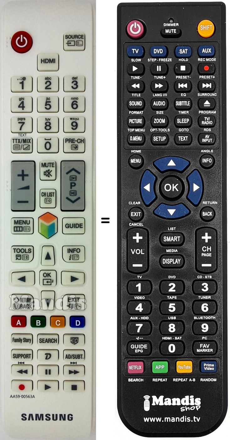 Télécommande qui remplace la télécommande d'origine AA59-00563A car elle possède les mêmes fonctions. Il ne s'agit pas d'une télécommande universelle mais d'une télécommande qui remplace celle d'origine. Vous recevrez la télécommande prête à fonctionner, vous n'aurez qu'à mettre les piles. Il n'est pas nécessaire de la programmer. Nous vous garantissons que la télécommande aura exactement les mêmes fonctions que celle d'origine.