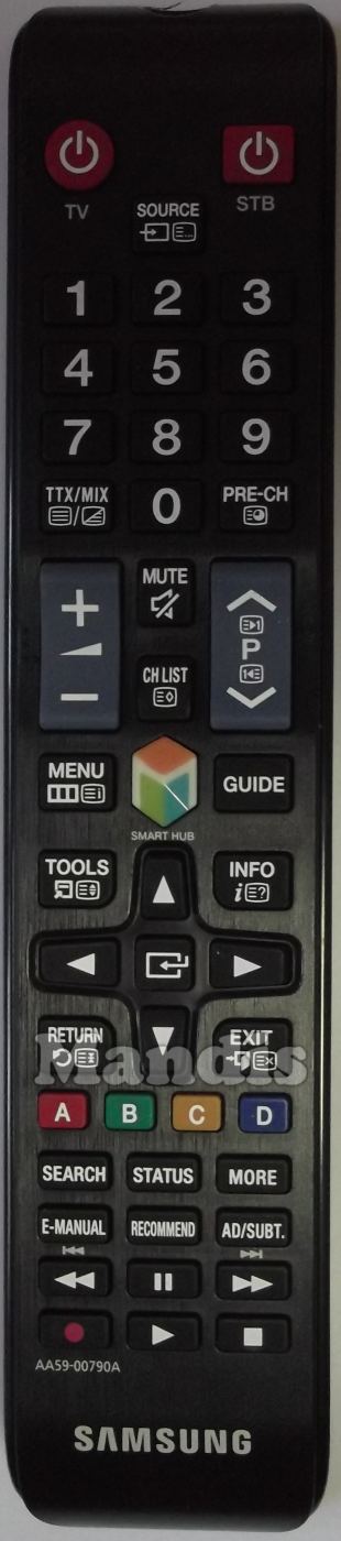 Power TV, Power STB, Source, 1, 2, 3, 4, 5, 6, 7, 8, 9, 0, TTX / MIX, Pre-Ch, Vol +, Vol -, Mute, CH List, P +, P -, Menu, Smart Hub, Guide, Tools, Info, Up, Down, Right, Left, , Return, Exit, Red / A, Green / B, Yellow / C, Blue / D, Search, Status, More, E-Manual, Recommended, AD / Subt., << / I<<, Pause, >> / >>I, Rec, Play, Stop