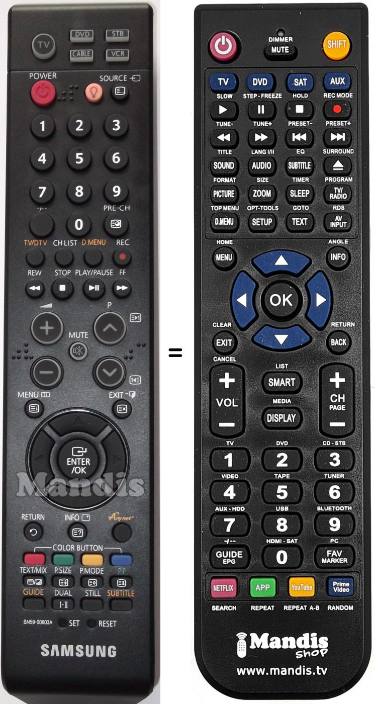 Télécommande qui remplace la télécommande d'origine TM87C (BN59-00603A) car elle possède les mêmes fonctions. Il ne s'agit pas d'une télécommande universelle mais d'une télécommande qui remplace celle d'origine. Vous recevrez la télécommande prête à fonctionner, vous n'aurez qu'à mettre les piles. Il n'est pas nécessaire de la programmer. Nous vous garantissons que la télécommande aura exactement les mêmes fonctions que celle d'origine.