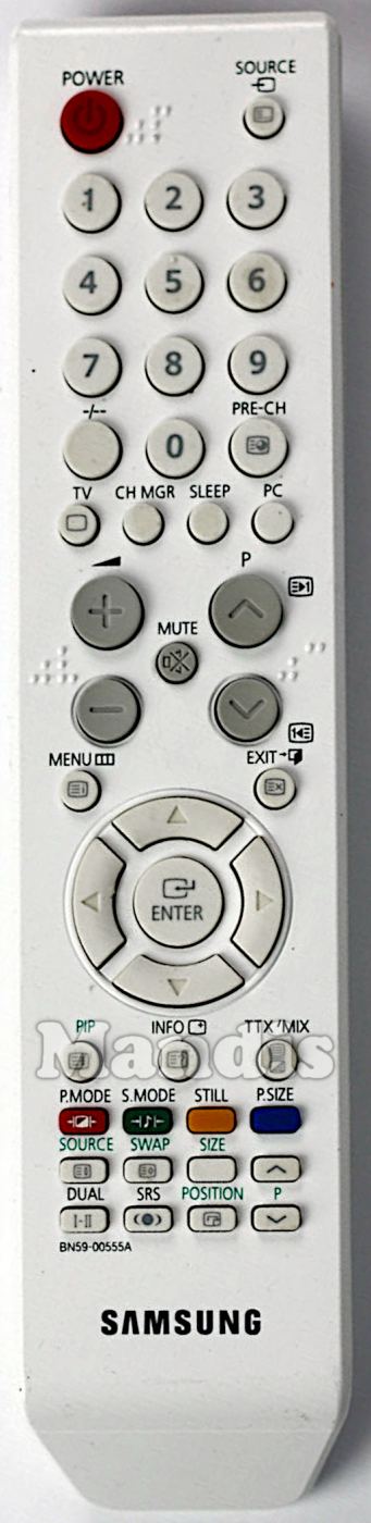 Power, Source, 1, 2, 3, 4, 5, 6, 7, 8, 9, 0, -/--, Pre-Ch, TV, CH MGR, Sleep, PC, Vol+, Vol-, Mute, P+ / Page+, P- / Page-, Menu, Exit, Up, Left, Enter, Right, Down, PIP, Info, TTX / MIX, Red / P.Mode, Green / S.Mode, Yellow / Still, Blue / P.Size, Source, Swap, Size, P+, P-, Dual I-II, SRS, Position