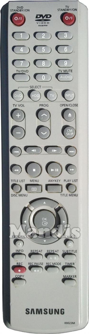 DVD Standby / On, TV Standby / On, 1, 2, 3, 4, 5, 6, 7, 8, 9, 0, TV / DVD, Audio / TV Mute, Select DVD, Select HDD, Select TV, Input, TV Vol +, TV Vol -, Prog +, Prog -, Open / Close, CM Skip, I<<, <II, II>, >>I, <<, Stop, Play / Pause, >>, Title List / Disc Menu, Menu, Anykey, Play List / Title Menu, Up, Right, Down, Left, OK, Return, Cancel, Info, Repeat, Repeat A-B, Subtitle, Rec, Rec Pause, Rec Mode, Timer, Copy, Marker