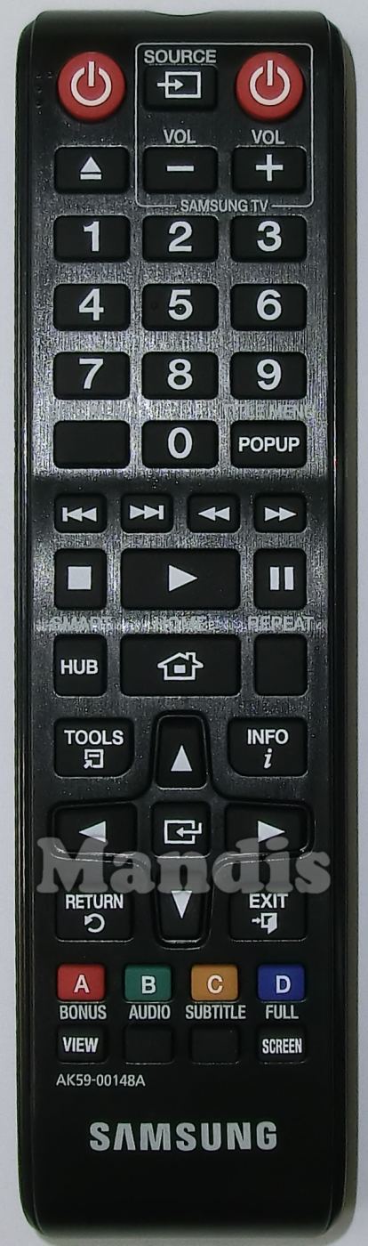Power, Open/Close, 1, 2, 3, 4, 5, 6, 7, 8, 9, 0, Disc Menu, Popup Menu, I<<, >>I, <<, >>, Stop, Pause, Play, Hub Smart, Repeat, Home, Tools, Info, Return, Exit, Up, Down, Right, Left, Enter, Red, Green, Yellow, Blue, View/Bonus, Audio, Subtitle, Screen/Full, Power Tv, Source Tv, Vol- Tv, Vol+ Tv