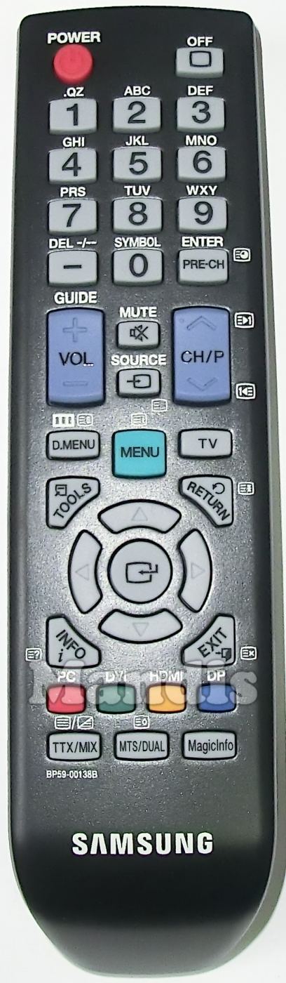 Power, Off, 1, 2, 3, 4, 5, 6, 7, 8, 9, 0, -/-- / DEL / Guide, Pre-Ch / Enter, Vol +, Vol -, Mute, Source, CH + / P +, CH - / P -, D. Menu, Menu, TV, Tools, Return, Up, Down, Rigth, Left, Enter, Info, Exit, Red / PC, Green / DVI, Yellow / HDMI, Blue / DP, TTX / Mix, Mts / Dual, MagicInfo