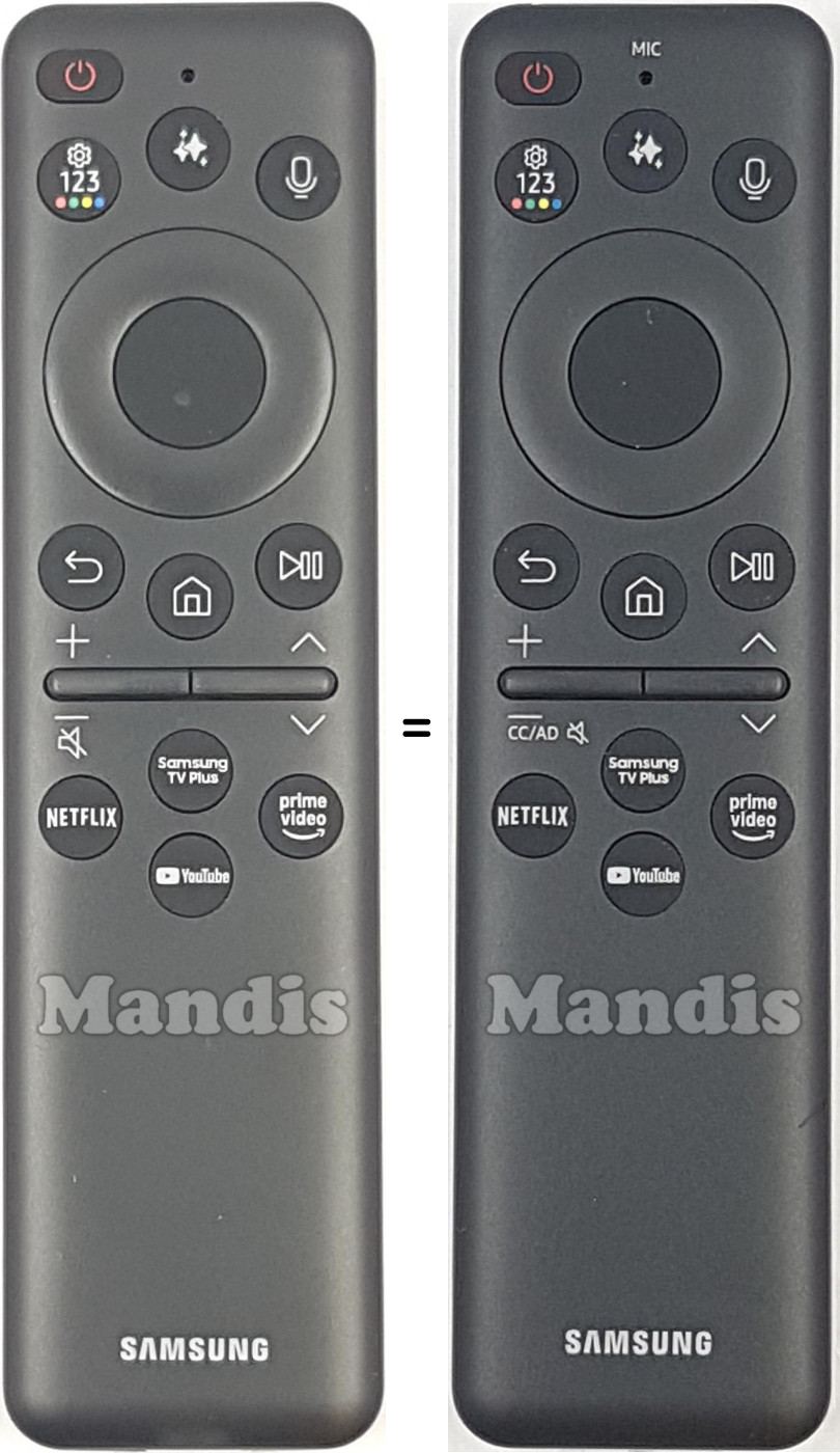 Power, 123/Colors, **, Micro, Up, OK, Down, Right, Left, Back, Home, Play/Pause, Netflix, Samsung TV Plus, prime video, YouTube, CH+, CH-, Vol+, Vol-, EPG, Mute