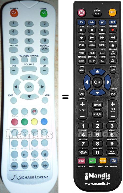 Ci-dessous, nous vous montrerons la correspondance entre chaque bouton de la télécommande d'origine et le bouton qui effectue la même fonction sur la télécommande de remplacement. Dans certains cas, vous devrez peut-être appuyer sur la touche SHIFT avant d'appuyer sur un autre bouton pour effectuer certaines actions. Ces fonctions supplémentaires sont souvent peu utilisées et sont incluses pour faciliter la compréhension de la télécommande de remplacement, ou parce que la télécommande d'origine comporte plus de boutons que son équivalent.