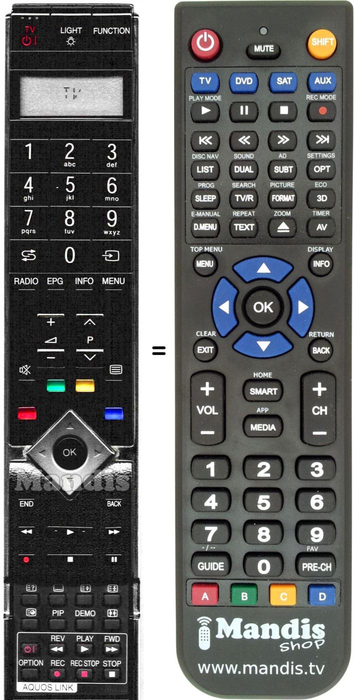 Cette télécommande remplit toutes les fonctions de la télécommande d'origine: TV Power, Light, Function, 1, 2, 3, 4, 5, 6, 7, 8, 9, 0, Recall, Input, Radio, EPG, Info, Menu, Vol+, Vol-, P+, P-, Mute, Text, Red, Green, Yellow, Blue, Up, Left, OK, Right, Down, End, Back, <<, Play, >>, Rec, Stop, Pause, [≡?], [....], [≡↕], [≡⧗], [≡◕], PIP, Demo, Format, Aquos Link Power, Aquos Link << REV, Aquos Link Play, Aquos Link >> FWD, Aquos Link Option, Aquos Link Rec, Aquos Link Rec Stop, Aquos Link Stop