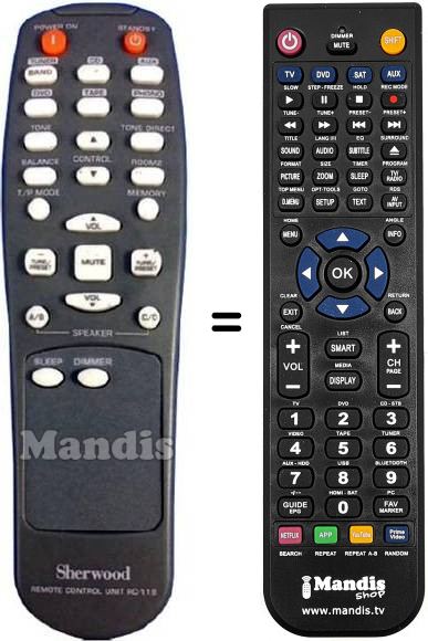 Télécommande qui remplace la télécommande d'origine RC119-1 car elle possède les mêmes fonctions.