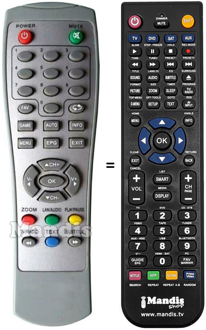 Télécommande qui remplace celle d'origine car elle possède les mêmes fonctions.