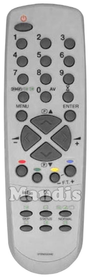 Power, 1, 2, 3, 4, 5, 6, 7, 8, 9, 0 / AV, P - P, Timer, Menu, Enter, Up / P+, Left / Vol-, Down / P-, Right / Vol+, Red, Green, Yellow / FT-, Blue / FT+, Info, Mute, P100 / Skip, Cancel / Status, Text / Normal, Reveal, Hold, Size