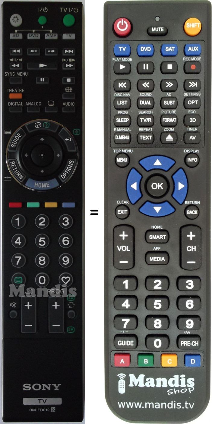 Ci-dessous, nous vous montrerons la correspondance entre chaque bouton de la télécommande d'origine et le bouton qui effectue la même fonction sur la télécommande de remplacement. Dans certains cas, vous devrez peut-être appuyer sur la touche SHIFT avant d'appuyer sur un autre bouton pour effectuer certaines actions. Ces fonctions supplémentaires sont souvent peu utilisées et sont incluses pour faciliter la compréhension de la télécommande de remplacement, ou parce que la télécommande d'origine comporte plus de boutons que son équivalent.
