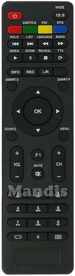 Power, 16:9 Wide, Red, Green / Subtitle, Yellow / FAV, Blue / EPG, I<< / Hold, >>I / List, << / Language, >> / Radio, Play / Index, Pause / Zoom, Stop / Reveal, Back / TTX, Info, Rec, L / R, , Smart S, Smart P, Up, Right, Down, Left, OK, Source, Menu, Vol +, Vol -, F1, Mute, CH +, CH -, 1, 2, 3, 4, 5, 6, 7, 8, 9, 0, Recall, Guide