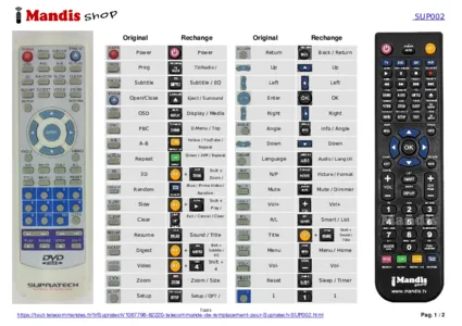 Cette télécommande remplace entièrement votre SUP002 et offre toutes les fonctions de l'originale.