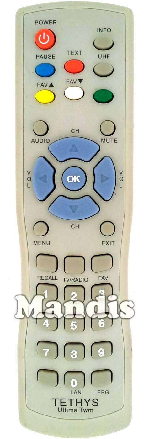 Power, Info, Blue/Pause, Red/Text, UHF, Yellow/Fav+, White/Fav-, Green, Mute, Audio, EXit, Menu, Up/CH+, Down/CH-, Right/Vol+, Left/Vol-, OK, Recall, Tv/Radio, FAV, 1, 2, 3, 4, 5, 6, 7, 8, 9, 0/LAN, EPG, Nothing