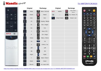 ![]() | 10 février 2026 Vous pouvez consulter la disposition des touches de la télécommande Tcl 06BTZNYYCRC602S. |