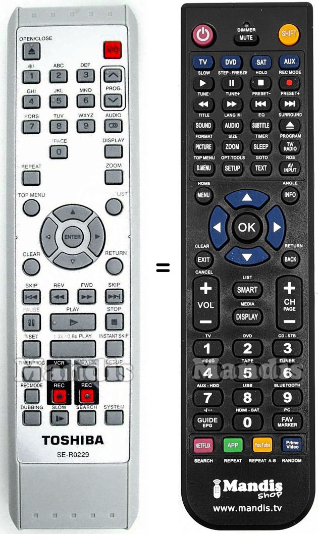 Ci-dessous, nous vous montrerons la correspondance entre chaque bouton de la télécommande d'origine et le bouton qui effectue la même fonction sur la télécommande de remplacement. Dans certains cas, vous devrez peut-être appuyer sur la touche SHIFT avant d'appuyer sur un autre bouton pour effectuer certaines actions. Ces fonctions supplémentaires sont souvent peu utilisées et sont incluses pour faciliter la compréhension de la télécommande de remplacement, ou parce que la télécommande d'origine comporte plus de boutons que son équivalent.