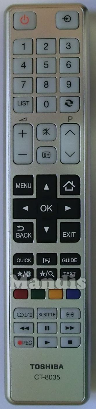 Télécommande d'origine CT-8035 (75037328) pour téléviseurs de la marque Toshiba. Il s'agit d'un modèle de télécommande d'origine.