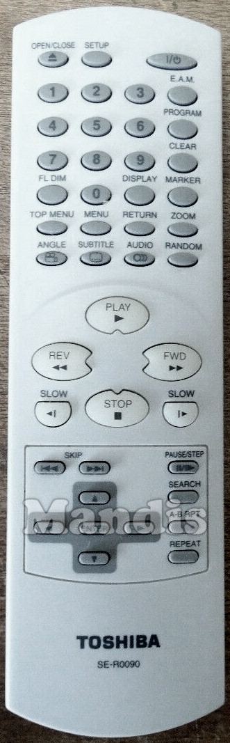 Power, Open / Close, Setup, E.A.M., Program, Clear, 1, 2, 3, 4, 5, 6, 7, 8, 9, 0, FL Dim, Display, Marker, Top Menu, Menu, Return, Zoom, Angle, Subtitle, Audio, Random, Play, << Rev, Fwd >>, Stop, <I Slow, Slow I>, I<< Skip, Skip >>I, Pause / Step, Search, A-B Rpt, Repeat, Up, Left, Enter, Right, Down
