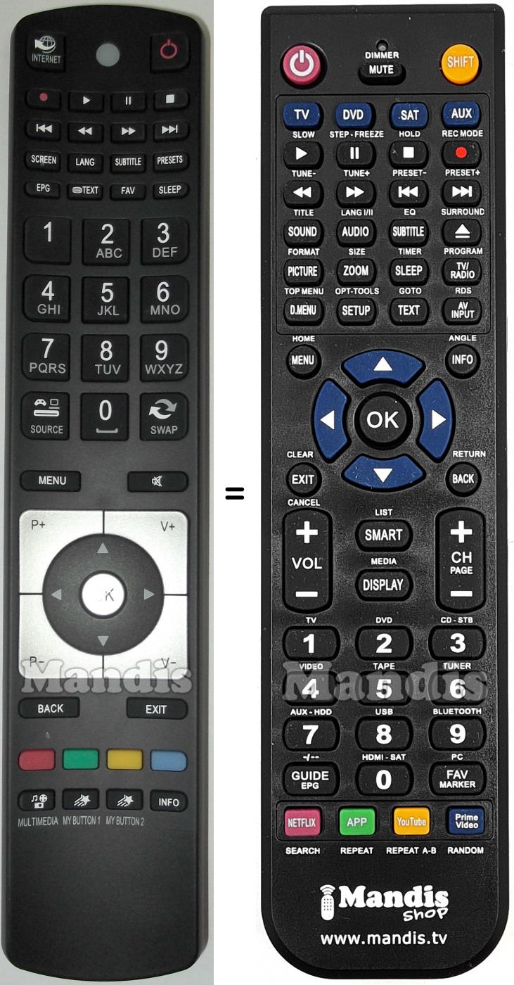 power, internet, rec, play, pause, stop, I<<, <<, >>, >>I, screen, lang, subtitle, presets, epg, text, fav, sleep, 1, 2, 3, 4, 5, 6, 7, 8, 9, 0, source, swap, menu, mute, pr+, pr-, vol+, vol-, ok, up, down, right, left, back, exit, red, green, yellow, blue, multimedia, my button , my button 2, info