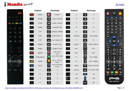 Cette télécommande remplace entièrement votre RC3920 (20501811) et offre toutes les fonctions de l'originale.