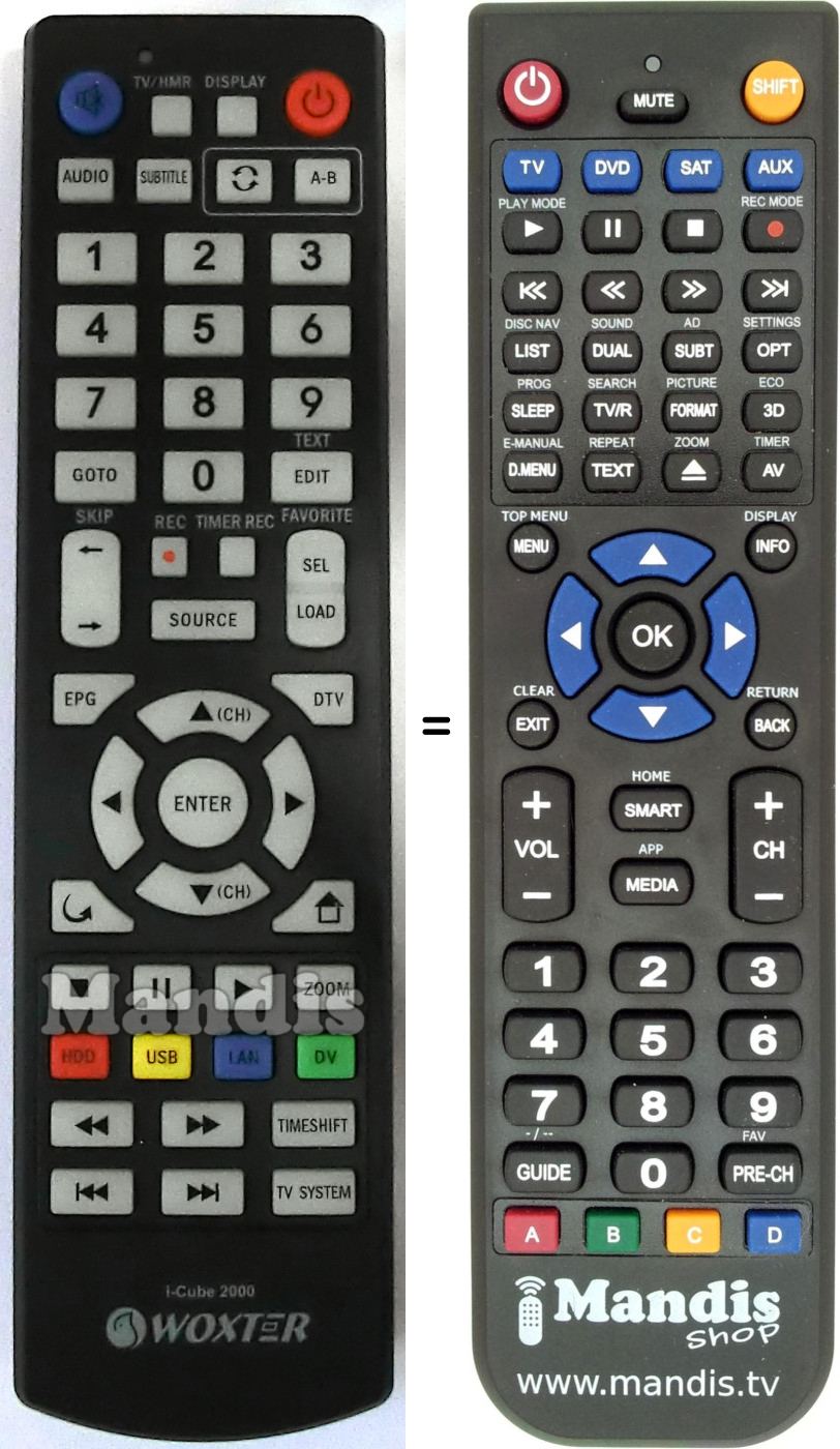 Ci-dessous, nous vous montrerons la correspondance entre chaque bouton de la télécommande d'origine et le bouton qui effectue la même fonction sur la télécommande de remplacement. Dans certains cas, vous devrez peut-être appuyer sur la touche SHIFT avant d'appuyer sur un autre bouton pour effectuer certaines actions. Ces fonctions supplémentaires sont souvent peu utilisées et sont incluses pour faciliter la compréhension de la télécommande de remplacement, ou parce que la télécommande d'origine comporte plus de boutons que son équivalent.