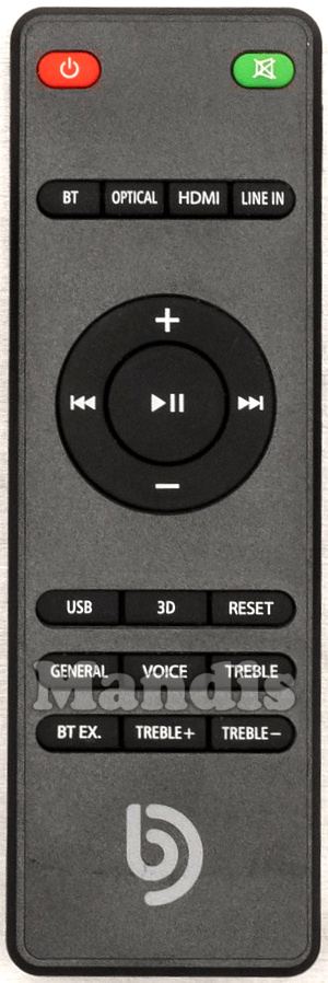 Power, Mute, BT, Optical, HDMI, Line In, +, I<<, >>I, -, Play/Pause, USB, 3D, Reset, General, Voice, Treble, BT Ex., Treble+, Treble-