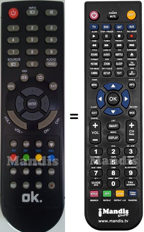 Ci-dessous, nous vous montrerons la correspondance entre chaque bouton de la télécommande d'origine et le bouton qui effectue la même fonction sur la télécommande de remplacement. Dans certains cas, vous devrez peut-être appuyer sur la touche SHIFT avant d'appuyer sur un autre bouton pour effectuer certaines actions. Ces fonctions supplémentaires sont souvent peu utilisées et sont incluses pour faciliter la compréhension de la télécommande de remplacement, ou parce que la télécommande d'origine comporte plus de boutons que son équivalent.